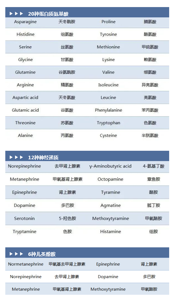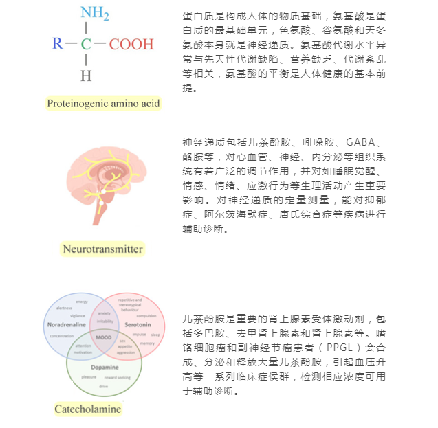 本次推出的3套kit是建立在高效液相色譜質譜平臺上,對實驗動物和人體血樣、尿樣中的20種蛋白質氨基酸、12種神經遞質和7種兒茶酚胺進行精準定量檢測。