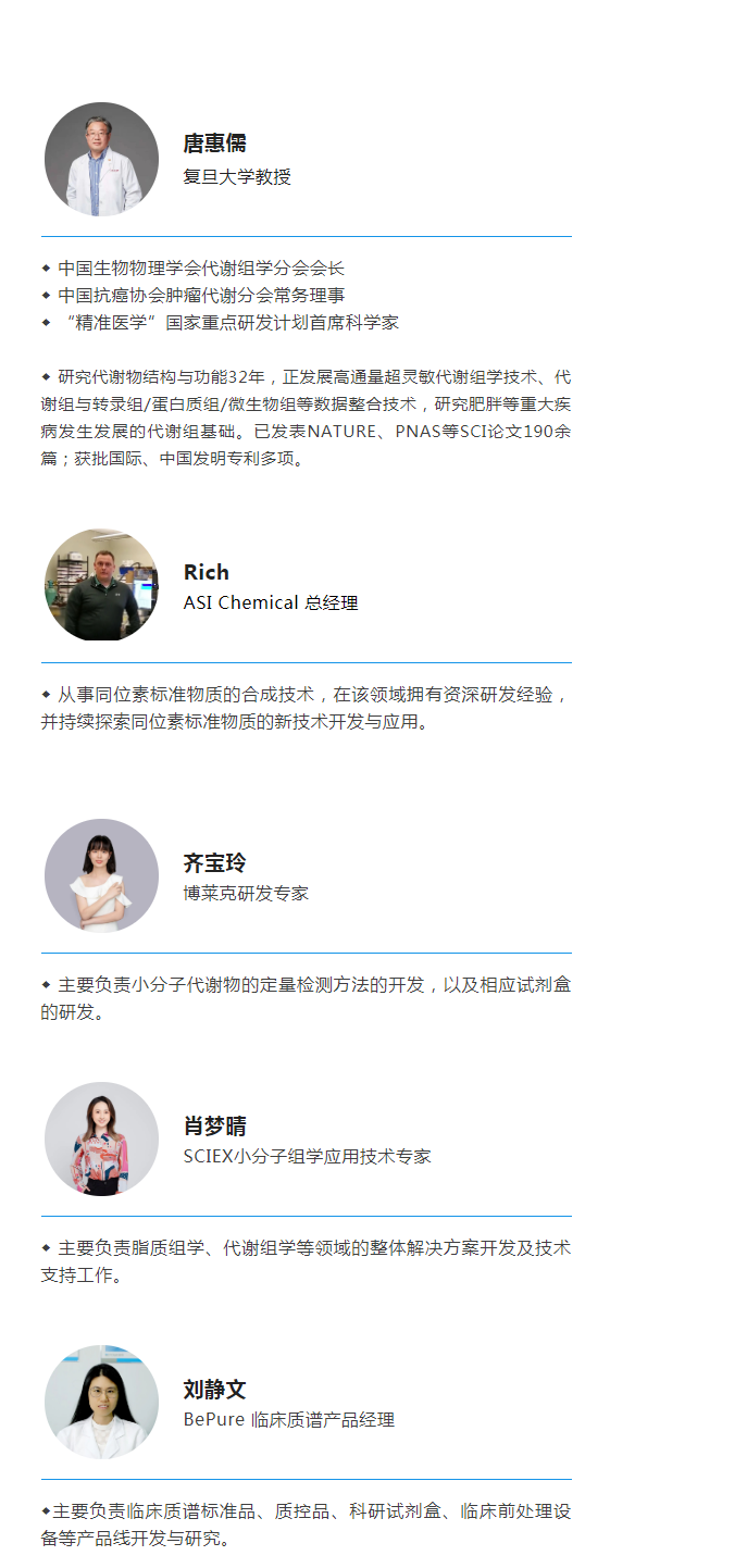 首期沙龍我們將于2022年6月22日在騰訊會議和bilibili嗶哩嗶哩上舉辦,由北京曼哈格生物科技有限公司(曼哈格,BePure)和博萊克(科技)武漢有限公司(博萊克,SMI)聯合主辦,邀請到的主咖嘉賓為復旦大學唐惠儒教授,他從事代謝物結構功能及代謝組學研究30余年,現任中國生物物理學會代謝組學分會會長、中國生物物理學會理事、中國抗癌協會腫瘤代謝分會常務理事、中國營養學會基礎營養學分會委員等職務。