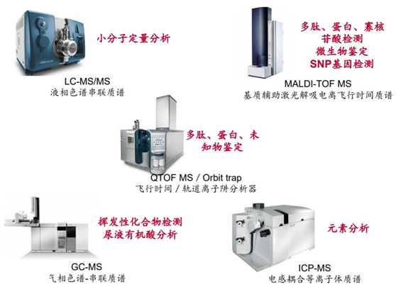 目前常用的質譜包括液相串聯質譜(LC-MS/MS)、氣相質譜(GC-MS)、電感耦合等離子體質譜(ICP-MS)和基質輔助激光解析-飛行時間質譜(MALDI-TOF),應用各不相同。自20世紀商業化質譜誕生后的幾十年間,不僅在蛋白質、酶、核酸等大分子的檢測中被廣泛使用,對于小分子代謝物來說,串聯質譜更具有絕對的優勢,其高靈敏度、高特異性、分析速度快、多指標同時檢測等優點,被稱為小分子代謝物檢測的“金標準”,也被認為是診斷領域的下一個“基因測序”。目前小分子定量檢測處于快速發展階段,國內已在新生兒篩查,藥物濃度監測、維生素D檢測等項目上廣泛使用,但與國外相比,還有非常大的成長空間。