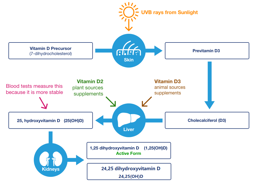 維生素D經皮膚合成或膳食攝入后,轉運至肝臟。在肝細胞內形成25(OH)D。接著轉運至腎臟進一步羥化為1,25(OH)2D,與維生素D受體(VDR)親和,被運輸到腸、骨、腎臟等目標組織中,隨后參與調節鈣和磷的吸收、轉移和重吸收。