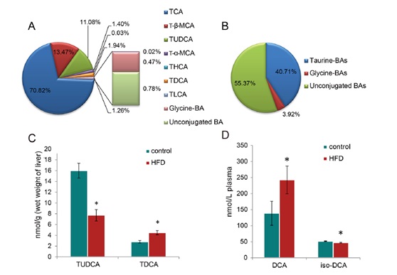 Figure 1. Bile acid compositions in (A) liver and (B) serum from rats fed with normal diet for 81 days. (C) Concentrations of TUDCA and TDCA in liver from both control (n = 12) and HFD (n = 12) groups. (D) Concentrations of DCA and iso-DCA in plasma from both control and HFD groups. Data are collected with UPLC-MS/MS method and shown as mean ± SEM in histograms (C) and (D). Asterisk (*) represents p-value <0.05; p-values were from the Student’s t test or Kruskal−Wallis test.