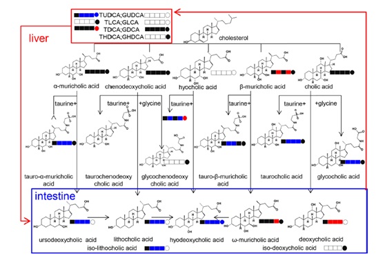 Figure 6. Biotransformation of bile acids in rodent. Four squares, respectively, indicate the level of specific bile acid in fecal samples at days 7, 28, 56, and 81, while the circle indicates the level of hepatic bile acids. Data are collected with UPLC-MS/MS method. Red denotes a significant increase in the HFD group (n = 12) compared with the control group (n = 12), while blue shows the decrease, black indicates no change, and white means none detected.