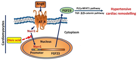 他們發現在合并左室肥厚的高血壓患者中,外周血油酸水平顯著低于無左室肥厚的患者。 因此,研究人員推測,油酸在高血壓進展至左室肥厚的病理過程中可能發揮著關鍵的作用。 進而利用新生小鼠的心肌細胞和心臟成纖維細胞開展了體外試驗,發現油酸可明顯削弱血管緊張素Ⅱ誘導的心肌細胞生長和心臟成纖維細胞膠原表達。 然后,該研究團隊對植入血管緊張素Ⅱ泵14天的小鼠的心臟功能、心肌細胞肥厚性生長和纖維化程度進行了分析。 他們發現,油酸可顯著抑制血管緊張素Ⅱ誘導的心臟重構。 RNA測序分析顯示,在植入血管緊張素Ⅱ泵的小鼠心臟中,成纖維細胞生長因子23(FGF23)的表達明顯上調,而在給予油酸治療的小鼠心臟中,FGF23的表達明顯受到抑制。 另外,給小鼠注射腺相關病毒-9(AAV-9)載體會導致心臟中FGF23過度表達,而這會加重血管緊張素Ⅱ誘導的心臟重構,導致油酸對心臟重構的抑制作用受到影響。 進一步研究顯示,油酸可通過阻止核受體相關蛋白1(Nurr1)從細胞質向細胞核易位,抑制血管緊張素Ⅱ誘導的FGF23表達。