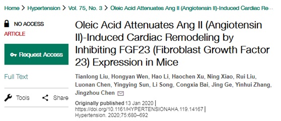 2020年1月,中國醫學科學院阜外醫院陳敬洲教授研究團隊在《Hypertension》雜志上發表了名為“Oleic Acid Attenuates Ang II (Angiotensin II)-Induced Cardiac Remodeling by Inhibiting FGF23 (Fibroblast Growth Factor 23) Expression in Mice”的論文,他們發現油酸(oleic acid)可能有助于預防高血壓患者左室肥厚和纖維化。 研究者認為,補充油酸可考慮作為高血壓患者預防左室肥厚和纖維化的一種新方法。我公司參與了其中油酸的定量檢測工作, 原文鏈接:https://doi.org/10.1161/HYPERTENSIONAHA.119.14167。
