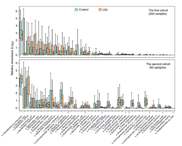 該研究團隊首先在兩個病例對照研究中對非破裂顱內(nèi)動脈瘤與對照之間的腸道菌群進行了宏基因組測序分析,發(fā)現(xiàn)顱內(nèi)動脈瘤患者腸道菌群結構異質(zhì)性顯著降低。物種水平分析發(fā)現(xiàn)47個物種的豐度在兩組間存在顯著差異,這其中有38個物種在顱內(nèi)動脈瘤組富集。該研究團隊發(fā)現(xiàn)一群Clostridium屬的物種包括C. bartlettii,C. nexile和C. bolteae在顱內(nèi)動脈瘤組顯著富集。然而,C. hathewayi(在2014年被正式更名為Hungatella hathewayi)卻是唯一一個在顱內(nèi)動脈瘤腸道中豐度降低的Clostridium屬成員。在47個差異物種中,有8個物種(17.0%)在第二人群中依然存在顯著差異。