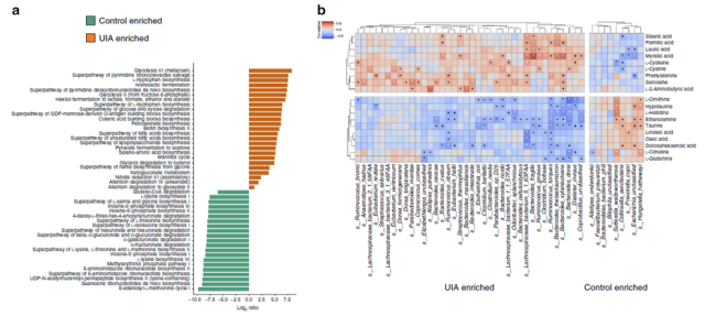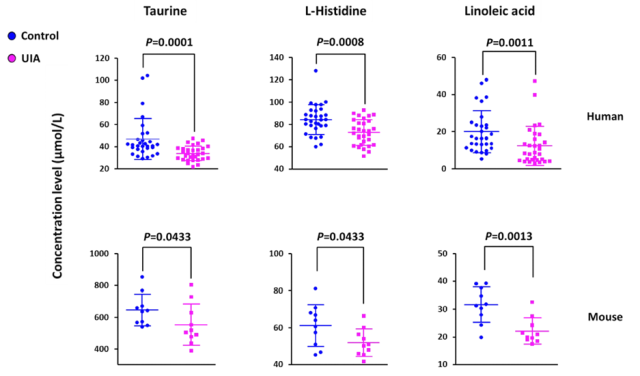 因此,該團隊進一步通過靶向代謝組學對兩組樣本血漿中的氨基酸及脂肪酸水平進行了定量檢測,發(fā)現(xiàn)7種脂肪酸和12種氨基酸在兩組血漿中存在顯著差異。進一步分析這19種代謝物與47種差異腸道菌種的相關性發(fā)現(xiàn)苯丙胺酸在顱內(nèi)動脈瘤患者血漿中豐度升高,牛磺酸、亞牛磺酸、L-組氨酸及瓜氨酸水平在顱內(nèi)動脈瘤患者中顯著降低,且與腸道中顯著改變的菌種具有較強相關性。提示腸道菌群可能通過調(diào)節(jié)血漿氨基酸和脂肪酸水平,促進顱內(nèi)動脈瘤疾病的發(fā)生發(fā)展。