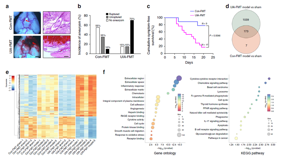 為了進一步探究是否腸道菌群的變化直接導致了顱內(nèi)動脈瘤的進展,該團隊進行了小鼠糞便移植實驗。與移植正常對照糞便的小鼠相比,移植顱內(nèi)動脈瘤患者糞便的小鼠顱內(nèi)動脈瘤的總體發(fā)生率顯著增加。此外,Kaplan-Meier分析提示兩組之間無癥狀生存曲線亦存在顯著差異,這表明腸道菌群紊亂能夠直接影響宿主顱內(nèi)動脈瘤的形成和破裂。對受體小鼠的腦血管進行轉錄組測序發(fā)現(xiàn)850個基因在動脈瘤受體小鼠中顯著上調(diào),362個基因在正常對照受體小鼠中顯著上調(diào)。此外,生物信息學分析發(fā)現(xiàn)這些差異基因能夠富集到與顱內(nèi)動脈瘤密切相關的信號通路,比如凋亡和炎癥相關通路等,提示腸道菌群可能通過這些通路影響顱內(nèi)動脈瘤血管病變。