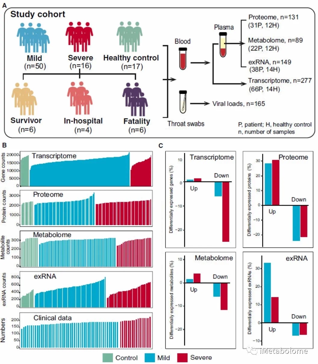 從66名不同病情的患者以及 17 名健康志愿者收集了血液和咽拭子樣本(圖1A)。為了確定 COVID-19 病理生理學(xué)是否與特定的分子變化相關(guān),研究者結(jié)合轉(zhuǎn)錄組學(xué)、蛋白質(zhì)組學(xué)和代謝組學(xué)的多組學(xué)方法檢查了總共 23,373 個(gè)表達(dá)基因、9,439 個(gè)蛋白質(zhì)、327 個(gè)代謝物和 769 個(gè) exRNA(圖 1B)。與健康對(duì)照相比,輕度和重度患者的表達(dá)基因有6.79%上調(diào)和26.0%的下調(diào);這一表達(dá)模式(上調(diào)/下調(diào))在蛋白質(zhì)水平為52.1%和51.7%,在代謝物水平為7.34%和15.6%,在exRNAs中為 39.9%和20.5%(圖 1C)。