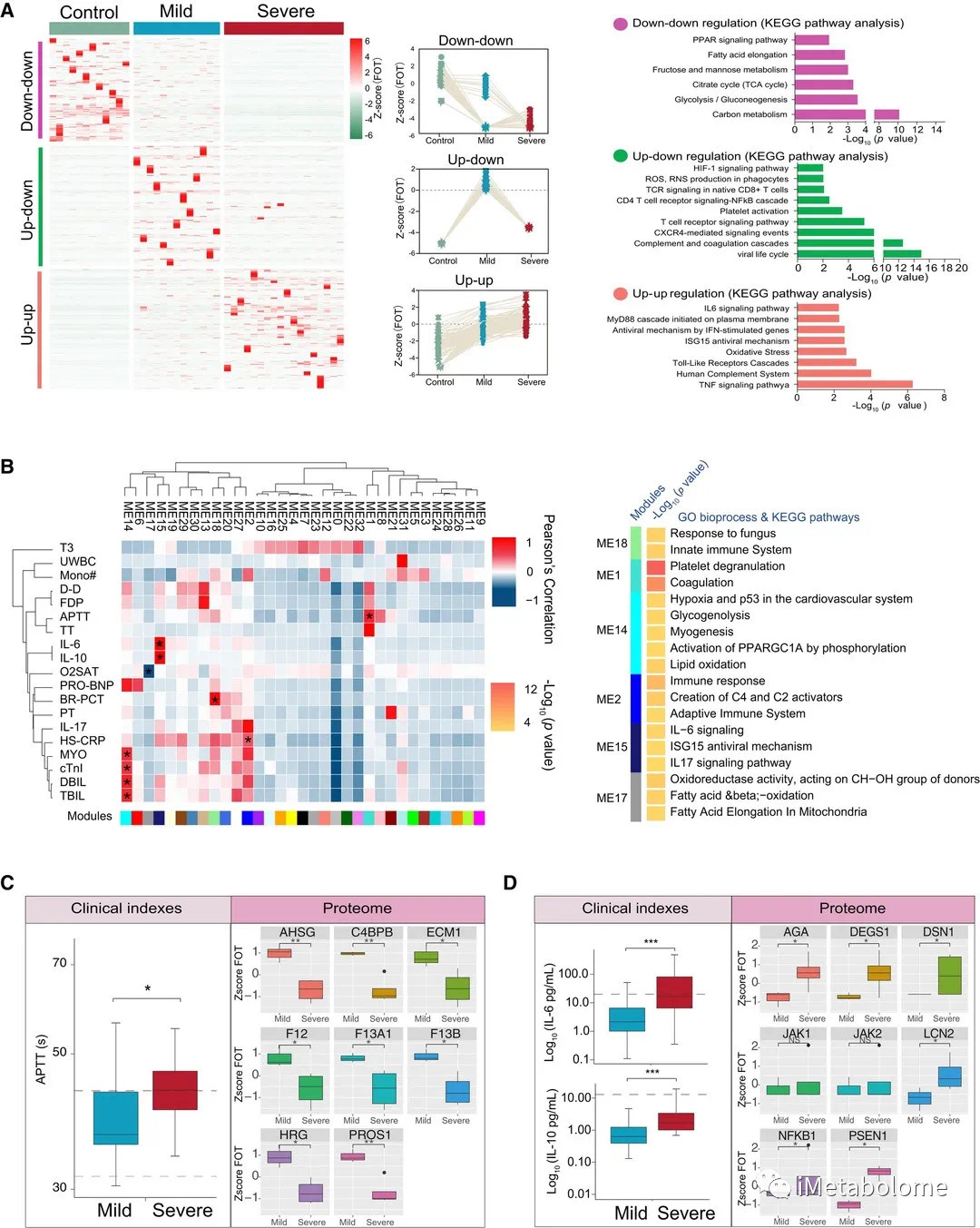 值得注意的是,多組學(xué)數(shù)據(jù)與經(jīng)典血液和生化參數(shù)之間存在顯著相關(guān)性:輕癥和重癥患者的三羧酸循環(huán) (TCA) 和糖酵解途徑均顯著下調(diào)。然而,這些患者的缺氧誘導(dǎo)因子 (HIF-1) 信號(hào)通路和宿主防御通路(T 細(xì)胞受體信號(hào)通路、ISG15 抗病毒信號(hào)通路)升高(圖 2A)。此外,加權(quán)基因共表達(dá)網(wǎng)絡(luò)分析 (WGCNA) 將蛋白質(zhì)組圖譜分成 33 個(gè)共表達(dá)模塊 (ME0-ME32)。其中,六個(gè)模塊顯示出與臨床參數(shù)的顯著相關(guān)性(圖 2B),特別是和活化部分凝血活酶時(shí)間 (APTT) 密切相關(guān),其表達(dá)下調(diào)可能表明 APTT 值較高(圖 2C)。相比之下,患者的血漿 IL-6 和 IL-10 水平與模塊 15 中的蛋白質(zhì)表達(dá)呈正相關(guān)(圖 2D)。除蛋白質(zhì)外,脂蛋白變異也與免疫變化顯著相關(guān),包括 IgG、單核細(xì)胞和降鈣素原。綜合起來,這些數(shù)據(jù)表明特定分子變異與 COVID-19 感染患者的病理生理變化之間存在關(guān)聯(lián)。