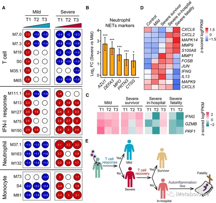 與可以通過強(qiáng) T 細(xì)胞反應(yīng)清除的流感病毒一樣,輕癥患者的 SARS-CoV-2 免疫力的特點(diǎn)是強(qiáng)大的 T 細(xì)胞反應(yīng),反映在入院時(shí) T 細(xì)胞信號(hào)激活(M7.3 模塊、M35.1 模塊)和 T 細(xì)胞分化(M19 模塊),隨后迅速減少(圖 5A))。表明T 細(xì)胞反應(yīng)對(duì)于成功抵御 SARS-CoV-2 的宿主防御是必不可少的。