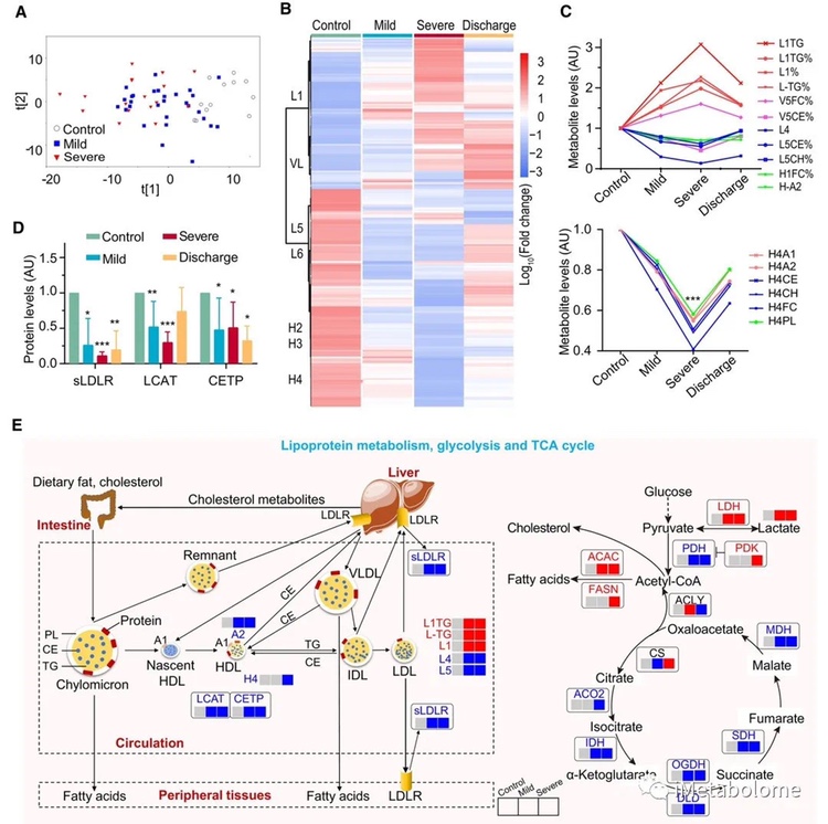 進(jìn)一步的統(tǒng)計(jì)分析突出了脂蛋白亞類及其組成成分的主要變化,包括 LDL1 (L1TG)、LDL4、VLDL5、HDL1 和 HDL4(圖 6C )。與健康對(duì)照組相比,輕度和重度患者的LDL1中的甘油三酯(TG)和VLDL5所有脂質(zhì)中的游離膽固醇(FC)水平均顯著升高,而LDL4和LDL5、LDL中的膽固醇、膽固醇酯均顯著降低。幸運(yùn)的是,大多數(shù)這些脂蛋白在患者出院后恢復(fù)(圖 6B和C).