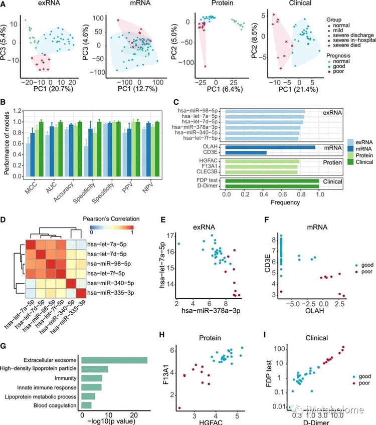 此外,研究者從四種類型的數(shù)據(jù)中各自確定了穩(wěn)健的預(yù)測模型和生物標(biāo)志物。每個(gè)數(shù)據(jù)集中的一兩個(gè)特征(表達(dá)的基因、蛋白質(zhì)、exRNA 和生化參數(shù))能夠清楚地將患者分為具有不同預(yù)后特征的兩組(圖 8D-I)。預(yù)后不良與 D-二聚體和纖維蛋白原降解產(chǎn)物水平升高以及 F13A1 表達(dá)降低有關(guān)(圖 8H 和 I),表明凝血狀態(tài)可能是監(jiān)測 COVID-19 進(jìn)展的關(guān)鍵因素之一。基于 mRNA 的模型顯示不良預(yù)后與較低水平的 CD3E 和較高水平的 OLAH 相關(guān),因此與 COVID-19 感染患者的免疫反應(yīng)高度一致(圖 8E)。此外,基于 exRNA 的預(yù)測因子包括 let-7 家族的成員(圖 8D 和 E)。最后,基于蛋白質(zhì)的模型突出了富含細(xì)胞外外泌體、脂蛋白代謝過程、先天免疫反應(yīng)和血液凝固的特征(圖8G 和 H)。