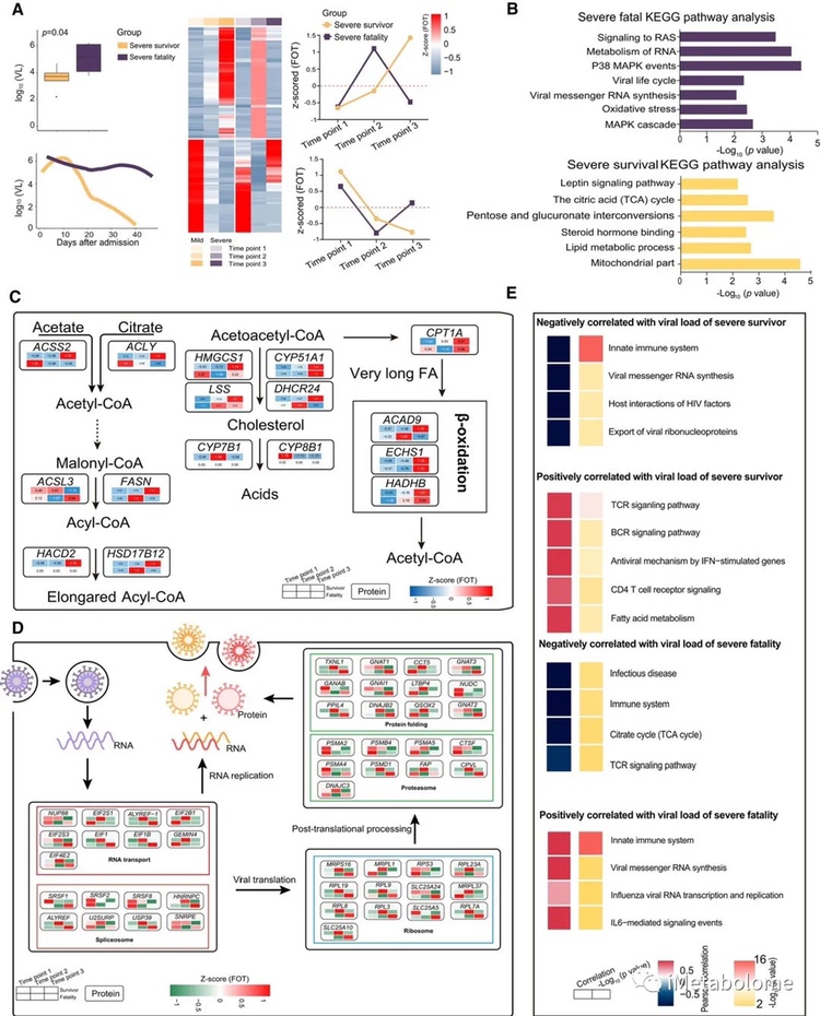 COVID-19 的嚴(yán)重程度和臨床結(jié)果也與病毒載量有關(guān)。總體而言,與存活者相比,入院時(shí) 5 例死亡病例咽拭子中的 SARS-CoV-2 RNA 載量顯著更高(圖 7A)。參與抗病毒過程的蛋白質(zhì),包括 TCR 和 BCR 信號(hào)通路,與重癥幸存者的病毒載量變化呈正相關(guān)。此外,參與病毒生命周期過程的蛋白質(zhì),包括病毒mRNA 合成和先天免疫反應(yīng),僅與重癥致死組的病毒載量變化呈正相關(guān)(圖 7E)。值得注意的是,重癥存活組中涉及線粒體功能、脂質(zhì)代謝過程、類固醇激素過程和 TCA 循環(huán)等途徑的蛋白質(zhì)(例如,FASN、ACSS2、CPT1A、HADHB)持續(xù)上調(diào)(圖 7B和 C)。然而,這種上調(diào)僅在重癥致死組入院后的早期階段觀察到。令人驚訝的是,與病毒生命周期、病毒 RNA 合成和氧化應(yīng)激相關(guān)的蛋白質(zhì)(例如,EIF、EIFB、RPL19、SLCA24)在入院后的幾個(gè)幸存者病例中下調(diào),但在死亡患者中保持高水平(圖 7B 和 D )。因此,SARS-CoV-2 可能會(huì)在感染期間利用宿主資源。