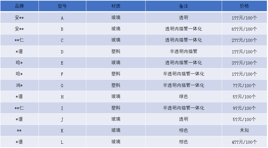 6)玻璃進樣瓶(平底,無內插管)的價格在0.6-2元,安**A款的價格最高。