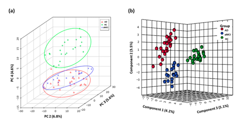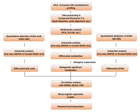 1.隊列設(shè)計:該研究招募了77名參與者,包括22名遺忘性輕度認知障礙患者(aMCI組)、27名癡呆性阿爾茨海默癥患者(AD組)以及28名認知正常的健康對照(HC組)。收集參與者的血清及新鮮糞樣進行代謝物分析。