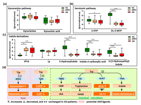 根據(jù)KEGG數(shù)據(jù)庫分析色氨酸代謝途徑的所有代謝物后,檢測并了9種色氨酸代謝物。這些代謝物涉及三個途徑,包括發(fā)生在宿主中,及發(fā)生在腸道中的吲哚衍生物途徑,這些過程都在腸道微生物的直接或間接控制下。發(fā)現(xiàn)AD組中通過宿主代謝的色氨酸-犬尿氨酸途徑?jīng)]有發(fā)生變化(下圖a,d),但在AD組中血清素代謝途徑中的代謝物顯著減少(下圖b,d)。例如,與HC組相比,5-羥基色氨酸(5-HTP)和DL-5-甲氧基色氨酸(DL-5-MTP)在aMCI組和AD組中降低。這些結(jié)果表明,在AD組中,宿主和微生物共同參與的色氨酸代謝受到了顯著干擾。此外,還發(fā)現(xiàn)腸道菌群代謝的色氨酸-吲哚衍生物途徑明顯受到干擾(下圖2c,d)。例如,與HC組相比,吲哚-3-丙酮酸(IPYA)在aMCI組和AD組中增加(p<0.05)。值得注意的是,與HC組相比,作為芳基烴受體(AhR)配體的吲哚衍生物在aMCI組和AD組中均顯著減少(p<0.01)。這些發(fā)現(xiàn)表明,在AD組中,腸道菌群代謝的色氨酸途徑受到顯著干擾,尤其是作為AhR配體的吲哚衍生物。