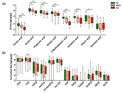 此外,由于AD組中SCFA的濃度發(fā)生了顯著變化,該研究還對HC、aMCI和AD三組糞樣中15種可產(chǎn)生SCFA的細菌數(shù)量進行了分析,發(fā)現(xiàn)與aMCI組或HC相比,AD組具有產(chǎn)SCFA能力的Clostridia數(shù)量顯著減少;與AD組和HC組相比,aMCI患者中產(chǎn)生丙酸的Bacteroides增多(下圖b)。產(chǎn)生SCFA的細菌數(shù)量和糞樣中SCFA濃度變化一致,證明AD組腸道中Firmicutes、Clostridia和Clostridiale的減少可能導(dǎo)致SCFA的降低。