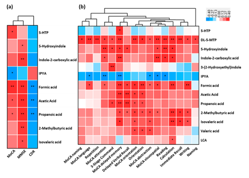 通過分析AD組的代謝表型與反映疾病嚴重程度(CDR)、認知功能(MMSE和MoCA)參數(shù)的相關(guān)性(下圖a,b)。研究發(fā)現(xiàn)認知障礙(MoCA)的升高與5-羥基色氨酸(5-HTP)及SCFA的減少呈正相關(guān),而與吲哚-3-丙酮酸的增加呈負相關(guān);降低的SCFA與CDR的升高呈負相關(guān)(p<0.05);吲哚衍生物(5-羥基吲哚和吲哚-2-羧酸)和SCFA(包括2-甲基丁酸和異戊酸)與認知障礙呈正相關(guān)(p<0.05)。此外,AD組糞樣中的代謝物與認知障礙(MoCA和MMSE)之間存在顯著相關(guān)性(下圖b)。這些結(jié)果表明,AD組紊亂的代謝表型(腸道微生物相關(guān))與認知障礙相關(guān)。