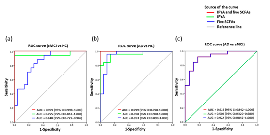 從AD組發(fā)生變化的14種代謝物(腸道微生物相關(guān))中,篩選出包括IPYA和5種SCFA在內(nèi)的6種潛在生物標記物。通過ROC曲線分析發(fā)現(xiàn)6種代謝物可有效區(qū)分aMCI、AD和HC組(下圖a,b)。