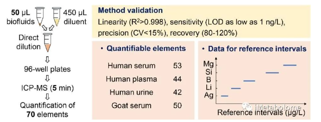復旦大學人類表型組研究院唐惠儒教授團隊針對上述難題,于2022年7月發表“Simultaneous quantification of 70 elements in biofluids within 5 min using inductively coupled plasma mass spectrometry to reveal elementomic phenotypes of healthy Chinese adults”于Talanta,該文章建立了一種操作簡便、元素覆蓋度高、樣品消耗少的多元素定量分析方法,可實現5分鐘內在50微升血液樣品中同時定量70種元素。該團隊利用所建方法測定了大批量血液樣品,證明該方法可較好地應用于大型人群隊列研究,并初步建立了健康成人血漿元素濃度的參考區間。