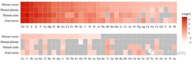 本研究采用所建立的方法對人血清、血漿、尿液和山羊血清四種生物體液進行元素組定量分析,分別定量了53、44、42、50種元素,觀察到不同生物樣本中的元素水平差異,并初步證實了該方法的穩健性良好。