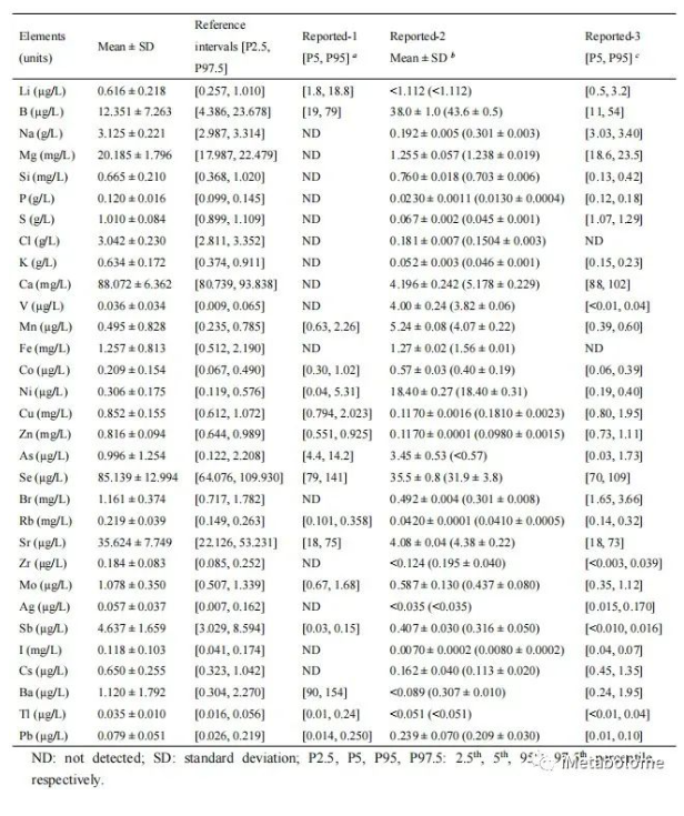 本研究利用所建方法測定了大批量血液樣品(約3950例),根據健康成人的選擇標準從中篩選出127例健康成人的血漿樣品,基于此建立了血漿中31個元素的濃度參考區間[P2.5, P97.5]。通過該結果,我們可以直觀地觀察到人血漿中各元素濃度水平的巨大差異。據了解,該研究首次報道了包含較多元素的中國健康成人血漿元素參考區間,并且大多數元素的參考區間與不同國家的研究結果相接近,具有可比性。