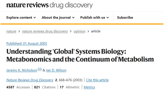 2013年8月,英國帝國理工學院的Jeremy K. Nicholson和Ian D. Wilson在Nature Reviews Drug Discovery上發表了綜述文章“Understanding ‘Global’ Systems Biology: Metabonomics and the Continuum of Metabolism”,概述了代謝組學應用中考慮環境因素對疾病的影響,在系統生物學模型中考慮“全局”代謝網絡,來幫助理解基因-疾病關系和藥物毒性問題。