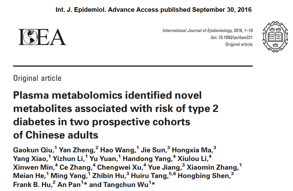 華中科技大學同濟醫學院鄔堂春團隊、南京醫科大學沈洪兵團隊等多位專家合作,于2016年9月在International Journal of Epidemiolog期刊上發表題為“Plasma metabolomics identified novel metabolites associated with risk of type 2 diabetes in two prospective cohorts of Chinese adults”的研究論文。通過靶向代謝組學檢測技術,分析2個獨立的中國成年人前瞻性隊列血漿中的,發現4種與T2D風險增加相關的小分子代謝物。原文鏈接:https://doi.org/10.1093/ije/dyw221。
