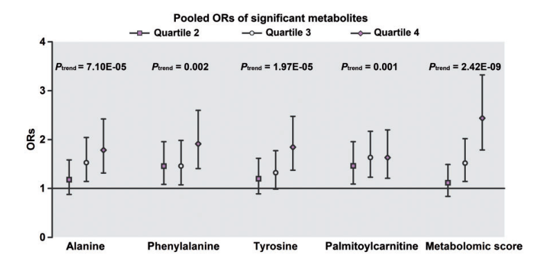 使用這4種小分子代謝物(臨床血漿復合代謝表型)結合血糖可對T2D風險進行預測。丙氨酸與胰島素敏感性受損有關,苯丙氨酸和酪氨酸的結果與之前報導的高加索人的結果一致,認為可能與胰島素抵抗有關,棕櫚酰肉堿參與脂肪酸代謝,但是如何在T2D發生發展中發揮作用的機制還不明確,可能與胰島素抵抗有關。