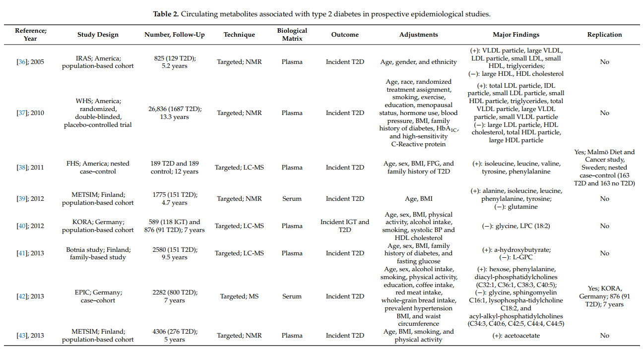 在過去的20多年中,代謝組學已廣泛應用于大型流行病學研究,一些代謝物/代謝通路已被鑒定和驗證與胰島素相關,可用于預測糖尿病的發生。將一些關鍵的前瞻性研究的結果在后文進行小結。