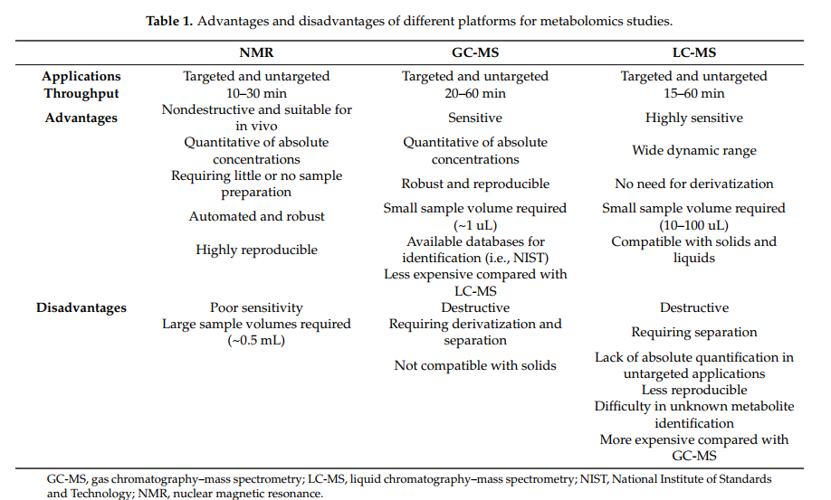 質譜(MS):以其高分辨率和高靈敏度的優勢成為代謝組學研究最廣泛的平臺。先通過色譜(GC或LC)分離代謝物,再通過質譜進行檢測。GC-MS適合檢測揮發性和熱穩定性的代謝物,如酮、醛、醇、酯和呋喃,也可以將脂肪酸、氨基酸等通過衍生化改變化學特性進行檢測。與LC-MS相比,重復性相對較差,但是儀器成本較低。LC-MS的應用范圍較廣,對于極性不同、種類繁多的代謝物,均能開發合適的檢測方法,且靈敏度更高。