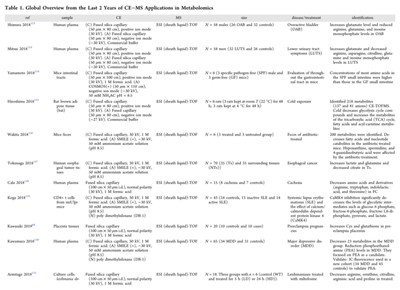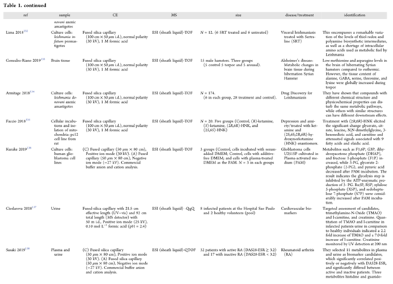 電噴霧電離(Electrospray ionization,ESI)是最常見的用于CE和MS耦合的軟電離技術。然而,CE−MS耦合本身并不簡單,它需要毛細管末端的導電液體保持電流并獲得兼容的電位,以形成穩定的電噴霧。表1列出了2018年至2019年7月報道的CE−MS在生物樣品靶向和非靶向代謝組學中的相關研究。