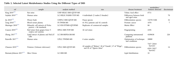 近年來,IMS-MS有了相當大的進步,主要分類有漂移時間離子遷移譜(Drift-time ion mobility spectrometry,DTIMS)、行波離子遷移譜(Traveling wave IMS,TWIMS)、高場不對稱波形離子遷移譜(High-field asymmetric waveform ion mobility spectrometry,FAIMS或DMS)、捕獲離子遷移譜(Trapped IMS,TIMS)等。對于代謝組學分析,TWIMS和DTIMS是最常用的IM類型,FAIMS和TIMS在小分子分析方面也具有巨大的潛力。表2總結了使用不同類型的IMS的最新代謝組學研究。