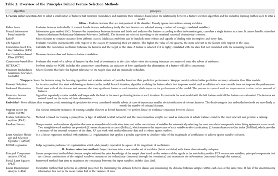 生物標志物的主要作用是區分不同的組別,例如,健康和疾病。因此,選擇攜帶相關生物信息的變量是代謝組學工作流程中最重要和最具挑戰性的任務之一。目前已經開發了許多單變量或機器學習方法,如聚類、回歸或分類,以幫助將組學數據轉化為實際的臨床應用。這些方法可以分為(I)特征子集選擇方法(刪除不起作用或多余的變量)和(II)特征提取方法(創建原始變量的組合作為新特征,以降低所選變量的維度)。表3提供了相關算法的概述。此外,特征選擇可以使用非監督模型或監督模型。多變量分析方法,如無監督主成分分析或有監督偏最小二乘法,已成為代謝組學的標準程序。然而,最近在代謝組學研究中報道了越來越多的嵌入式方法,如隨機森林(RF)、神經網絡或最小絕對值收斂和選擇算子(LASSO)方法,以及許多其他基于機器學習算法的方法。