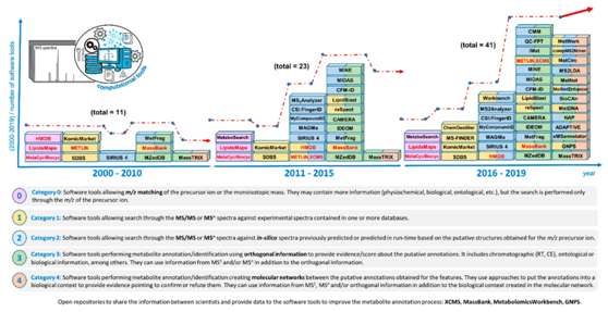 圖2.代謝物注釋和鑒定的時間軸及軟件工具的開發