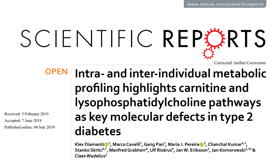 2 型糖尿。Type 2 Diabetes, T2D)是一種復雜的代謝疾病,通常由多個組織中的胰島素抵抗引起。瑞典烏普薩拉大學Claes Wadelius團隊于2019年7月在Scientific Reports期刊上發表題為“Intra- and inter-individual metabolic profiling highlights carnitine and lysophosphatidylcholine pathways as key molecular defects in type 2 diabetes”的研究論文。通過非靶代謝組學檢測技術,分析43個供體的五個關鍵代謝組織(血清、內臟脂肪組織、肝臟、胰島和骨骼。,發現 92 種代謝物在非糖尿病患者和 T2D 受試者之間存在顯著差異,這一分析可以增加 T2D 發展過程中多器官之間代謝相互作用的理解。原文鏈接:https://doi.org/10.1038/s41598-019-45906-5。