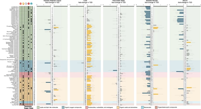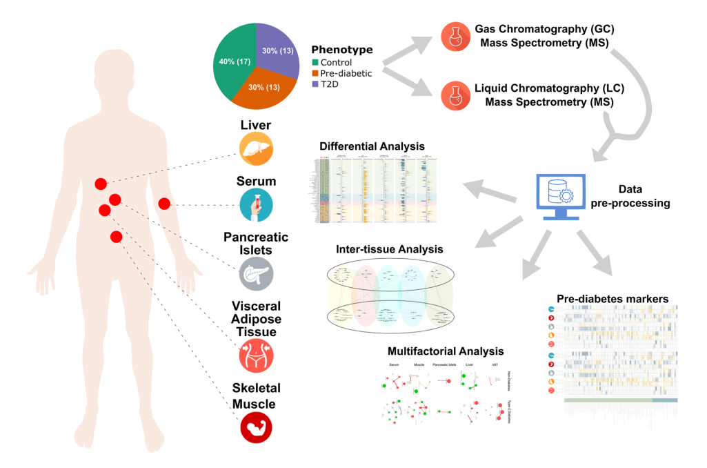 43 名器官捐贈者分為健康、糖尿病前期和 T2D 三組,5個代謝組織:VAT(內臟脂肪組織)、肝臟、胰島、骨骼肌和血清,選自 EXODIAB 生物庫的大量多器官供體。 這些供體的BMI、年齡和性別沒有統計學差異。