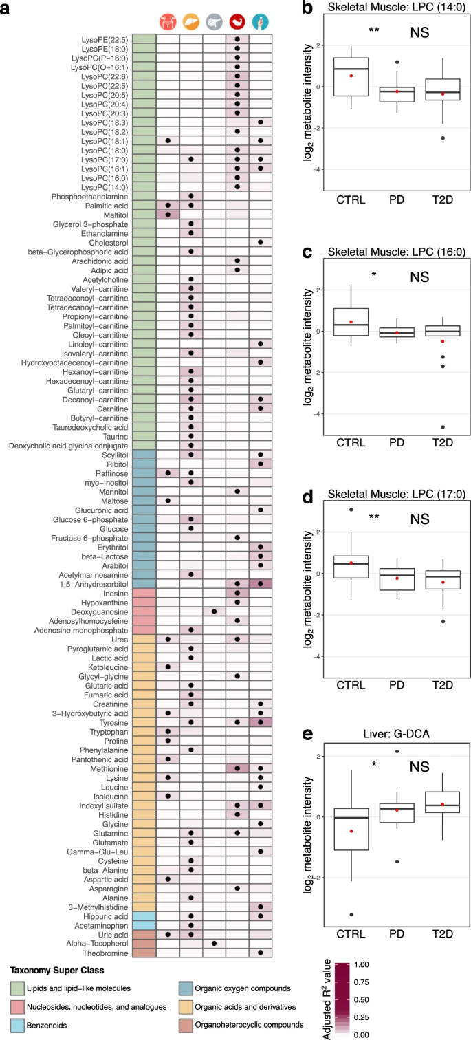 在 T2D 樣本中發生變化的代謝物是脂質和類脂分子,LPC 和肉堿高度富集,在血清、肌肉和肝臟中模式相同。當比較 T2D 和對照受試者時,我們觀察到肌肉和血漿中 LPC 系統性降低,但肝臟中沒有,這可能是糖尿病的一個強有力的指標。對照組與糖尿病前期、糖尿病前期與 T2D 的成對比較顯示肌肉中 LPC 的下降趨勢。具體來說,糖尿病前期肌肉中的 LPC 顯著減少,雖然我們觀察到 T2D 進一步減少,但它沒有超過統計學意義的閾值。