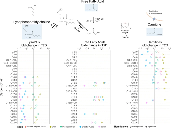 我們觀察到 T2D 患者肝臟中短鏈和中鏈肉堿顯著增加,胰島和血清中也有類似的趨勢。相反,在肌肉中觀察到肉堿減少的趨勢,特別是非常短鏈的肉堿在 T2D 中顯著減少。