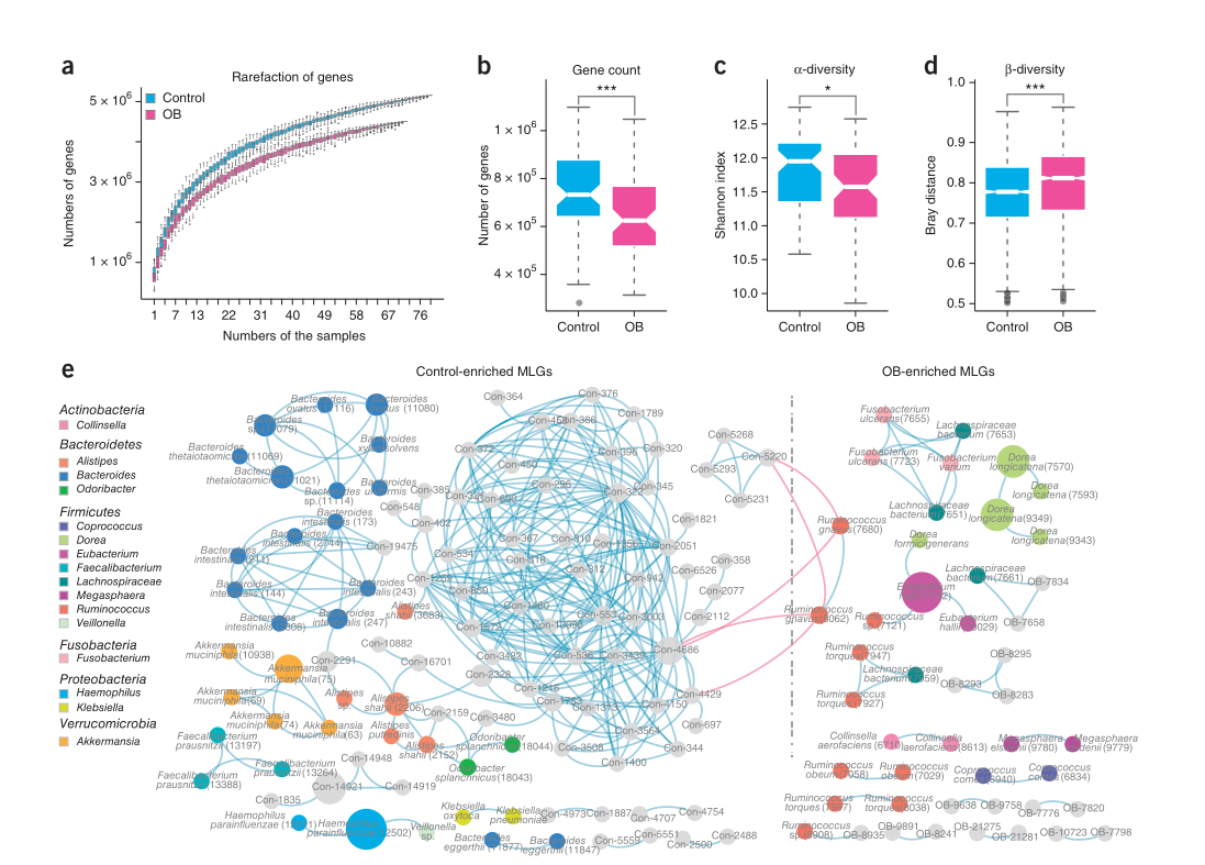 我們對(duì)257個(gè)糞便樣本進(jìn)行了鳥(niǎo)槍定序法分析(第一隊(duì)列中來(lái)自72個(gè)肥胖個(gè)體和79個(gè)瘦對(duì)照的151個(gè)樣本,第二隊(duì)列中來(lái)自23個(gè)肥胖個(gè)體和26個(gè)對(duì)照的49個(gè)樣本,以及來(lái)自23個(gè)肥胖個(gè)體的63個(gè)樣本,包括6個(gè)接受sg的病例組)。我們發(fā)現(xiàn)這些年輕、肥胖的個(gè)體的基因計(jì)數(shù)和細(xì)菌多樣性低于對(duì)照組(圖1a-c),表明肥胖方面的基因豐富度較低而與種族或年齡無(wú)關(guān)。還觀察到肥胖微生物組的β多樣性較高,表明肥胖個(gè)體的群落結(jié)構(gòu)比瘦對(duì)照組更為異質(zhì)(圖1d)。使用宏基因組關(guān)聯(lián)分析,使用全基因組關(guān)聯(lián)分析,我們確定了350524個(gè)與肥胖相關(guān)的基因(P<0.01,Wilcoxon秩-總和測(cè)試,F(xiàn)DR=0.047)。關(guān)聯(lián)分析也顯示P肥胖相關(guān)基因顯著富集的價(jià)值分布具有低P值的標(biāo)記,表明這些基因與肥胖有關(guān)。我們確定了一個(gè)由MLG組成的細(xì)菌群落,多形擬桿菌、單形、卵形類(lèi)桿菌、類(lèi)桿菌,在瘦的對(duì)照組中顯著富集(圖1e)。