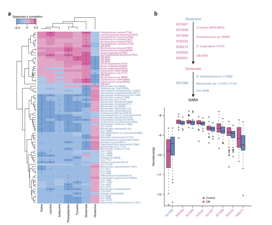 在檢測(cè)到的氨基酸中,與瘦對(duì)照組相比,谷氨酸在肥胖個(gè)體中表現(xiàn)出最顯著的增加。谷氨酸與16種富含肥胖的MLG呈正相關(guān),與18種含有編碼谷氨酸代謝相關(guān)酶的基因的對(duì)照富含MLG呈負(fù)相關(guān)(圖3a)。值得注意的是,富含肥胖癥的瘤胃球菌(obesitynriched ruminocococus sp.)、D. longicatena和C.comes以及OB-8293,它們擁有編碼從谷氨酰胺中產(chǎn)生谷氨酸所需酶的基因(圖3b),與循環(huán)谷氨酸水平正相關(guān),與谷氨酰胺水平負(fù)相關(guān)。這些觀察結(jié)果提示循環(huán)中谷氨酸和谷氨酰胺的水平可能反映了這些細(xì)菌種類(lèi)豐度的變化。