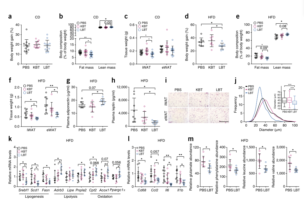 多形擬桿菌是人類(lèi)腸道中的優(yōu)勢(shì)菌群,它的消耗和肥胖以及血清中的氨基酸濃度相關(guān)。基于此,我們研究了腸道中的多形擬桿菌與宿主肥胖之間的可能因果關(guān)系。使用未經(jīng)熱處理的活的多形擬桿菌灌胃,顯著降低常規(guī)飼養(yǎng)小鼠的總體和腹股溝脂肪量并增加了瘦組的體重(圖4a-c)。進(jìn)一步,該措施會(huì)減輕高脂肪飲食喂養(yǎng)的小鼠的體重的增加和肥胖(圖4d-f)。與用磷酸鹽緩沖鹽水(PBS)或熱滅活多形擬桿菌灌胃的HFD小鼠相比,用活多形擬桿菌灌胃的HFD小鼠的脂聯(lián)素血漿濃度較高,而瘦素血漿濃度較低(圖4g、h)。曾經(jīng)關(guān)于白色脂肪組織的研究表明,給予活的多形擬桿菌比給予PBS(磷酸緩沖鹽水)和未經(jīng)熱處理的活的多形擬桿菌的脂肪細(xì)胞更小(圖4i,j)。此外,與脂肪生成有關(guān)的編碼蛋白質(zhì)的基因(包括Srebf1、Scd1和Fasn)的mRNA水平在灌胃活多形擬桿菌的高脂肪飲食喂養(yǎng)的小鼠的白色脂肪組織中較低,而與脂肪分解和脂肪酸氧化有關(guān)的基因(包括Adrb3、Pnpla2、Cpt2、Acox1和Ppargc1a)的表達(dá)較高(圖4k)。高脂肪飲食喂養(yǎng)的小鼠脂肪組織中炎癥標(biāo)記物Cd68、Ccl2、Il6和Il1b的表達(dá)因灌胃活的多形擬桿菌而減弱,表明炎癥狀態(tài)有所改善(圖4l)。然而,我們觀察到三組的空腹血糖或胰島素濃度及脂肪組織中磷酸化AKT水平?jīng)]有顯著差異。喂飼多形擬桿菌對(duì)食物攝入和24小時(shí)糞便熱量含量均無(wú)影響)。值得注意的是,我們檢測(cè)到,與用PBS灌胃的高脂肪飲食喂養(yǎng)的小鼠相比,用活的多形擬桿菌灌胃的HFD小鼠的循環(huán)氨基酸豐度較低,包括谷氨酸、苯丙氨酸、亮氨酸和纈氨酸(圖4m)。值得注意的是,有報(bào)道稱(chēng)谷氨酸可誘導(dǎo)脂肪分解減少和脂肪細(xì)胞增大從而引起肥胖。