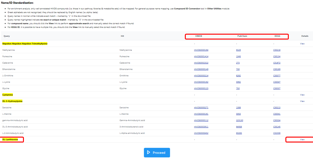 ②對于標黃化合物名稱,應先單擊“ View”進行近似搜索,然后手動選擇正確的匹配項,點擊三個數據庫中下方代碼即可顯示該數據庫下相應化合物的詳細信息,點擊繼續。