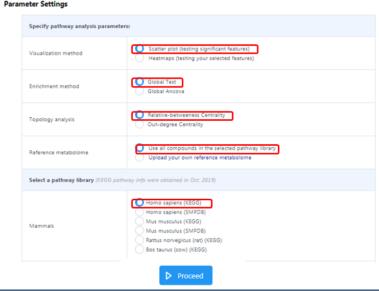 可視化方法選擇散點圖,富集方法選擇全局測試,拓撲分析選擇中介中心性,參考代謝組選擇使用所選路徑庫中的所有化合物,人類KEEG數據庫,點擊繼續。