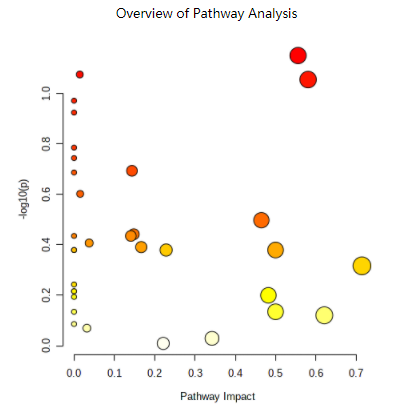 上圖為氣泡圖根據通路富集分析中的p值和通路拓撲分析中的通路影響值顯示了所有匹配的通路,將鼠標置于每個路徑節點上將顯示其路徑名稱,單擊節點將在右側面板上顯示對應通路圖,縱坐標-LOG(P)值由通路富集分析得出,-LOG(p)值越大顏色越紅(p值越小)橫坐標Pathway Impact值由通路拓撲分析得出,Pathway Impact值越大氣泡越大。-LOG(p)越大差異越明顯,Pathway Impact值越大代謝物在通路中作用越大,故處于右上角的通路最具有研究意義。