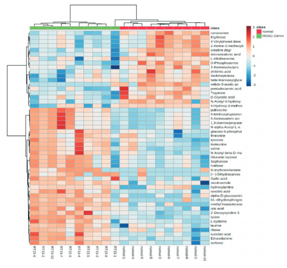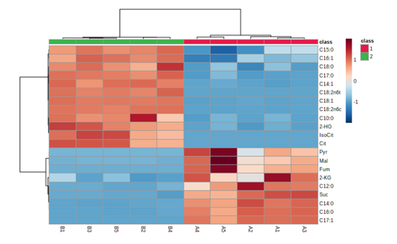 圖中每個每個彩色單元格代表一個代謝物的濃度值。紅色代表高于均值,顏色越深,值越大,藍(lán)色代表低于平均值,顏色越深,值越小。上方的樹狀圖是將數(shù)據(jù)進(jìn)行聚類分析,本質(zhì)上利用的是多組值間兩兩的差異程度或者相似程度(比如歐式距離、相關(guān)系數(shù)等)作為依據(jù),對多組值進(jìn)行層級聚類,以最終得到樣本間聚類的遠(yuǎn)近關(guān)系。