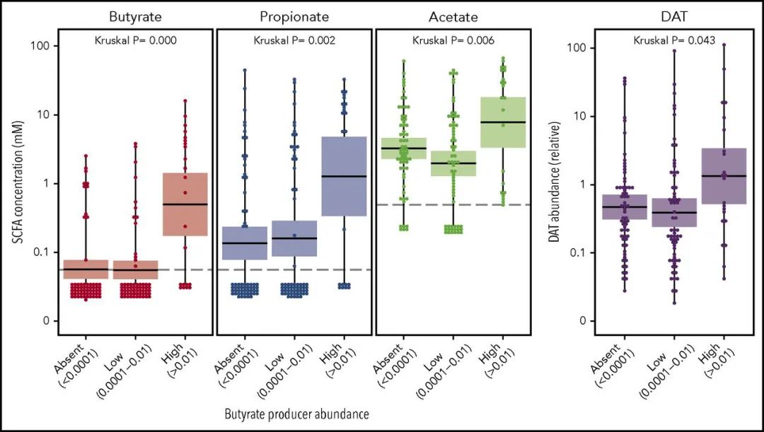 丁酸鹽糞便濃度與產丁酸鹽細菌的豐度相關。丁酸鹽生產者的豐度也與其他代謝物的產量相關,包括乙酸鹽、丙酸鹽和去氨基酪氨酸。