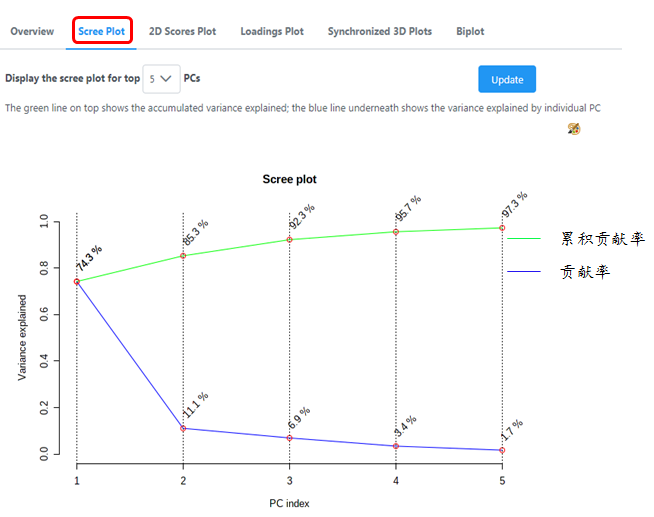 碎石圖(scree plot)即貢獻率圖,是希望圖形一開始很陡峭,如懸崖一般,而剩下的數(shù)值都很小,如崖底的碎石一樣。顯示各主成分的特征值貢獻率。如圖中顯示PC1貢獻率為74.2%,PC2貢獻率為11.1%...