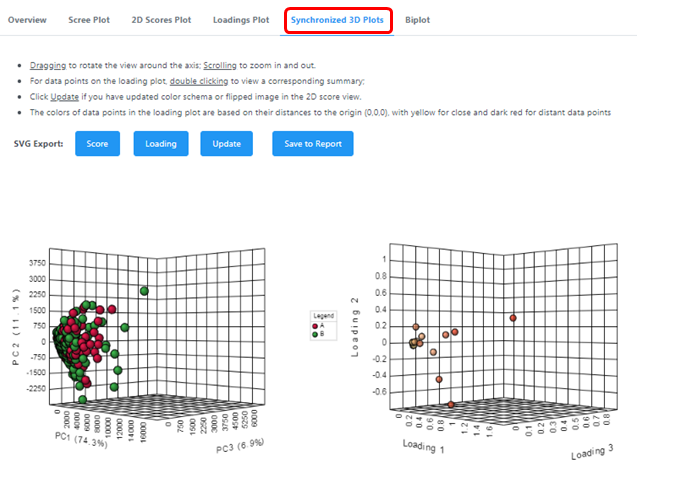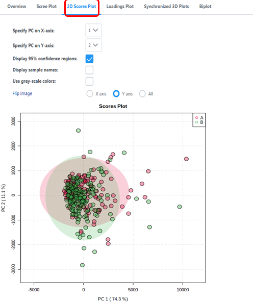 PCA得分圖有二維和三維兩種展示形式,在二維得分圖中橫坐標(biāo)PC1表示第一主成分,縱坐標(biāo)PC2表示第二主成分,百分比表示該主成分對數(shù)據(jù)集的解釋率,圓圈表示95%的置信區(qū)間;圖中的每個點表示一個樣品,同一個組的樣品使用同一種顏色表示,Group為不同的分組;PCA得分圖可以讓我們非常直觀地看出各個樣本之間的相似性。例如在一張PCA得分圖中,數(shù)個樣本的點聚在一起,那么就說明這幾個樣本之間的相似性非常高,反之,如果幾個樣本的點非常分散,則說明這幾個樣本之間的相似性比較低。還可以看出組間是否有差異、QC樣本是否穩(wěn)定。
