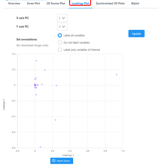 荷載圖:把主成分1和主成分2的荷載點出一個二維圖以直觀的顯示它們?nèi)绾谓忉屧瓉淼淖兞康模@個圖就叫做荷載圖。每個點對應(yīng)該物質(zhì)對第一主成分和第二主成分的相關(guān)系數(shù)。相關(guān)系數(shù)的絕對值越大說明主成分對該變量的代表性越大。